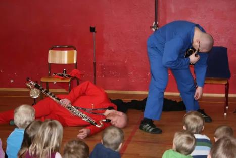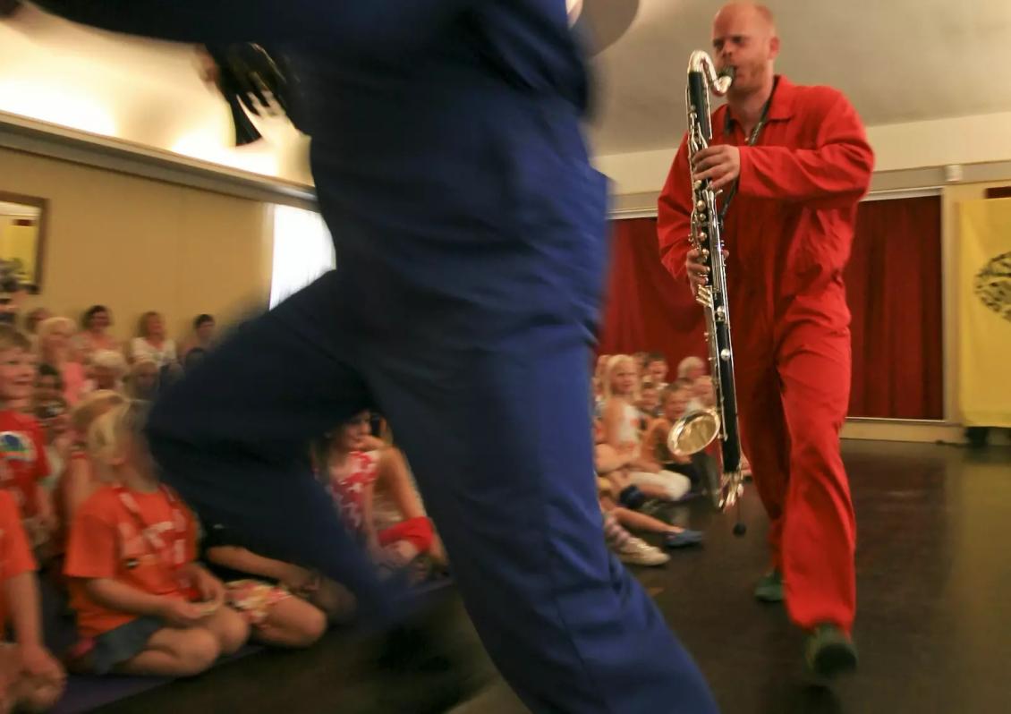 Klangbein ⚪ ⚫ Se alle bilder, videoer, lydklipp, vedlegg“Sint som en okse? Blid som ei lerke? Målet er å inspirere og utvide publikums syn på musikk, gjennom å fortelle historier med bruk av musikalske og visuelle elementer. Hverdagslige hendelser og følelser blir vist gjennom musikken. De to vennene Morten og Ole Jørn spiller improvisert musikk på forskjellige blåseinstrumenter. Duoen vil ta publikum med på en oppdagelsesreise i ulike stemninger. I tillegg vil de ha med seg lyder og rytmer som de har laget hjemme. De liker variasjon og dynamikk, og leker med både kjente og ukjente temaer. Publikum får ikke sitte stille, men blir involvert og skal også få dirigere deler av konserten - uten at utøverne kommer til å si noe. Hva skjer om musikerne ikke reagerer på tilrop, men kun på bevegelser? Om utøvere og produsenter
